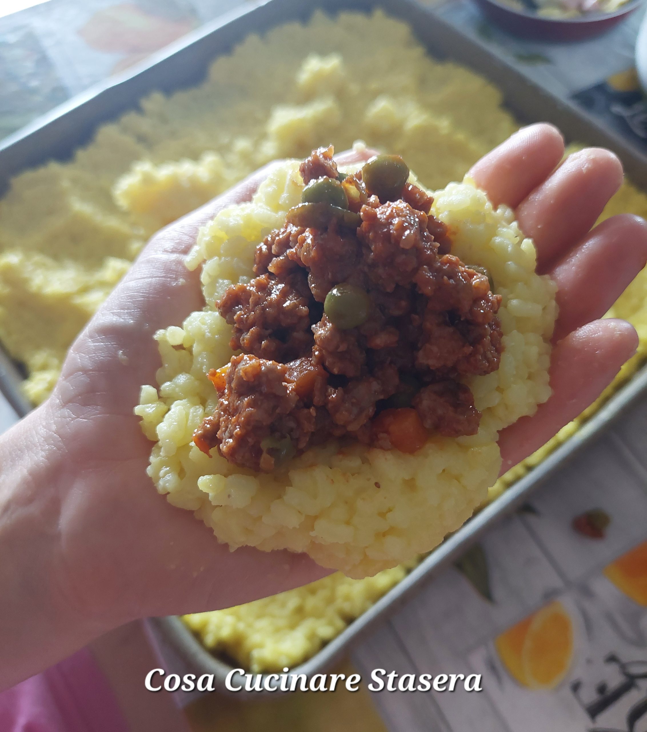 Aggiungete, quindi, il ripieno per le Arancine al Burro.