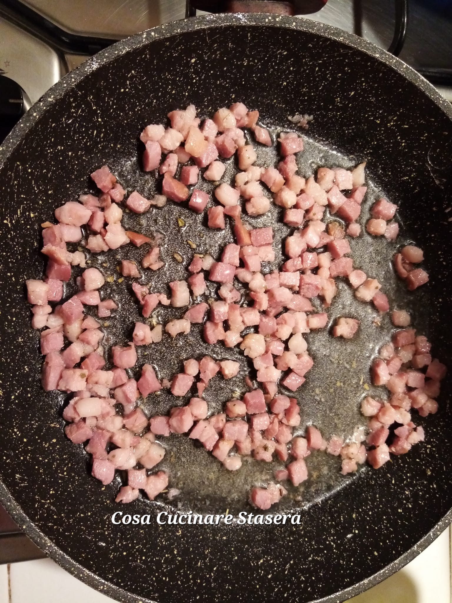 Versate i cubetti di pancetta in una padella antiaderente e rosolate per circa 10 minuti a fiamma medio alta;